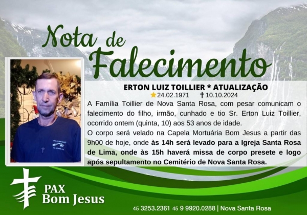 A Família Toillier de Nova Santa Rosa, com pesar comunicam o falecimento do filho, irmão, cunhado e tio Sr. Erton Luiz Toillier, ocorrido ontem (10) aos 53 anos de idade.