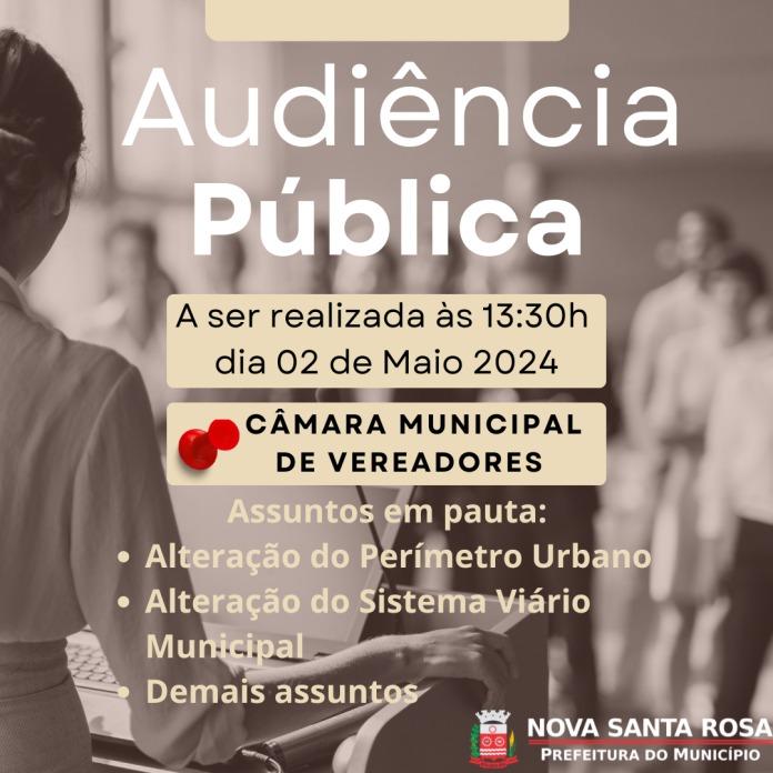 A Prefeitura de Nova Santa Rosa convoca a população e as entidades civis e de classe do município para prestigiarem a Audiência Pública.