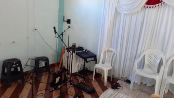 Os bandidos arrombaram uma porta de blindex, entraram na Igreja e furtaram 3 caixas de som, um baixo, um violão e uma guitarra.