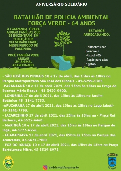 Em comemoração aos 64 anos do Batalhão de Polícia Ambiental - Força Verde estão sendo desenvolvidas ações em todo o Estado do Paraná.