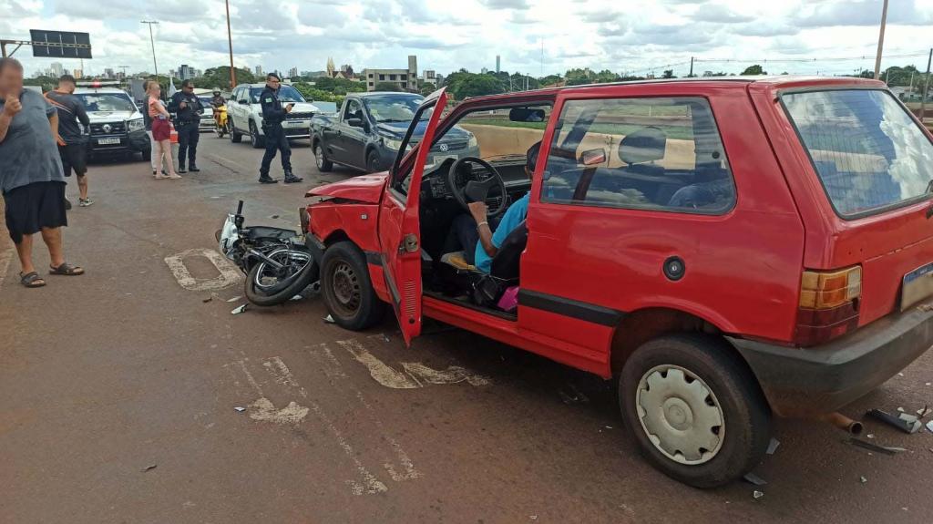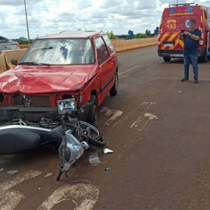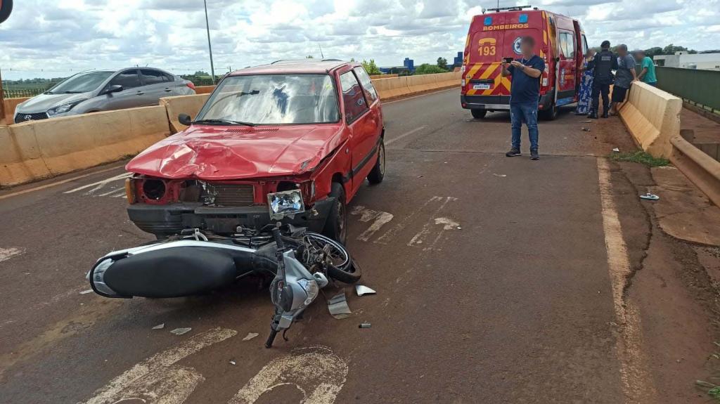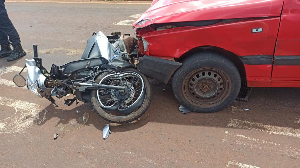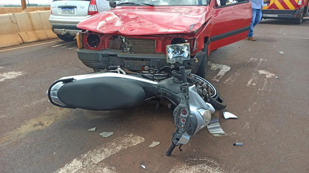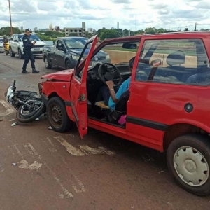 Um acidente de trânsito foi registrado nesta tarde de quarta-feira (12) na Avenida Parigot de Souza, sobre o viaduto da BR-163, em Toledo. A colisão envolveu um Fiat Uno conduzido por um idoso, e uma motocicleta Yamaha Crypton 100 cilindradas, pilotada por uma jovem de 26 anos.