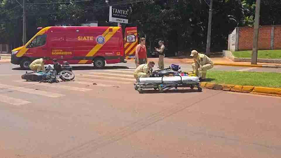 Desta vez, a batida envolveu duas motocicletas. Uma Mottu Sport, conduzida por um entregador, seguia pela avenida em direção ao Jardim Santa Maria quando colidiu com uma Honda Titan verde, que estava na Rua João Orestes Ruaro. Com o impacto, os dois condutores caíram e se feriram.