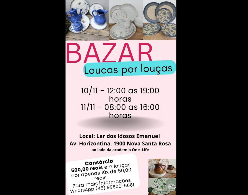 Começa nesta segunda-feira (10) o bazar “Loucas por Louças”, em Nova Santa Rosa. O evento acontece no Lar dos Idosos Emanuel, localizado na Avenida Horizontina, 1900, ao lado da academia One Life.