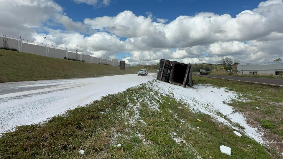 O veículo transportava ureia e, durante o trajeto, o semi-reboque se soltou da composição e tombou. O produto se espalhou pela pista sentido Toledo e também pelo canteiro central da rodovia.