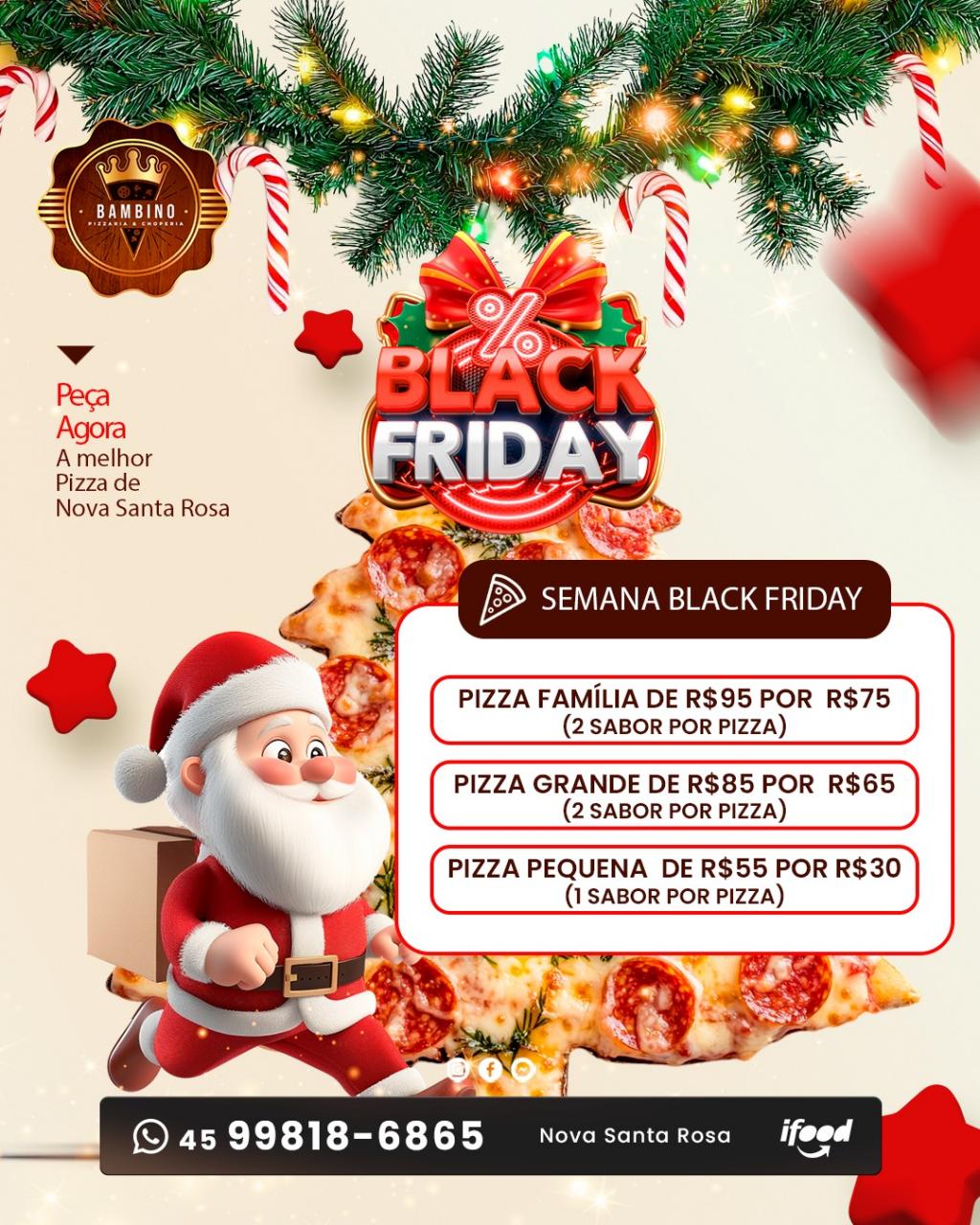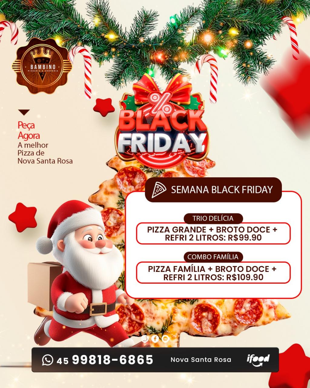 A Bambino Pizzaria preparou uma semana especial de Black Friday para quem gosta de aproveitar boas ofertas sem abrir mão do sabor. As promoções já estão valendo em Nova Santa Rosa e incluem descontos nas pizzas, combos especiais e um rodízio com preço diferenciado.