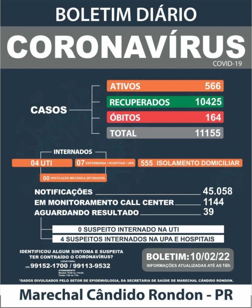 O setor de epidemiologia da Secretaria Municipal de Saúde divulgou hoje (10), o boletim diário dos casos de Covid-19 em Marechal Cândido Rondon.