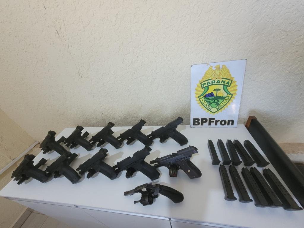 Na bagagem de um passageiro de 24 anos de nacionalidade paraguaia foram encontradas dez pistolas calibre 9mm e um revólver calibre .38 além de 20 carregadores de pistola.