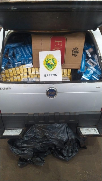 Após revista veicular, foi constatado que o automóvel estava com 30 caixas de cigarros contrabandeados e o condutor não foi localizado.