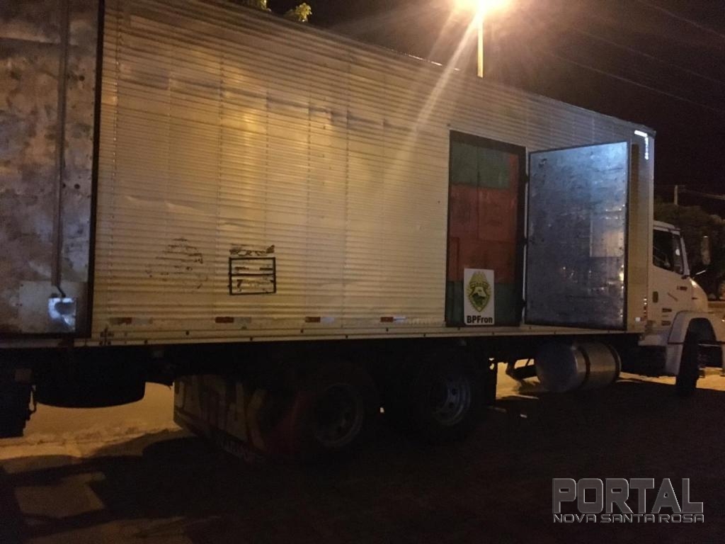 Ao abrir o furgão do caminhão foi constatado que estava completamente carregado de caixas de cigarros (aproximadamente 600 caixas).