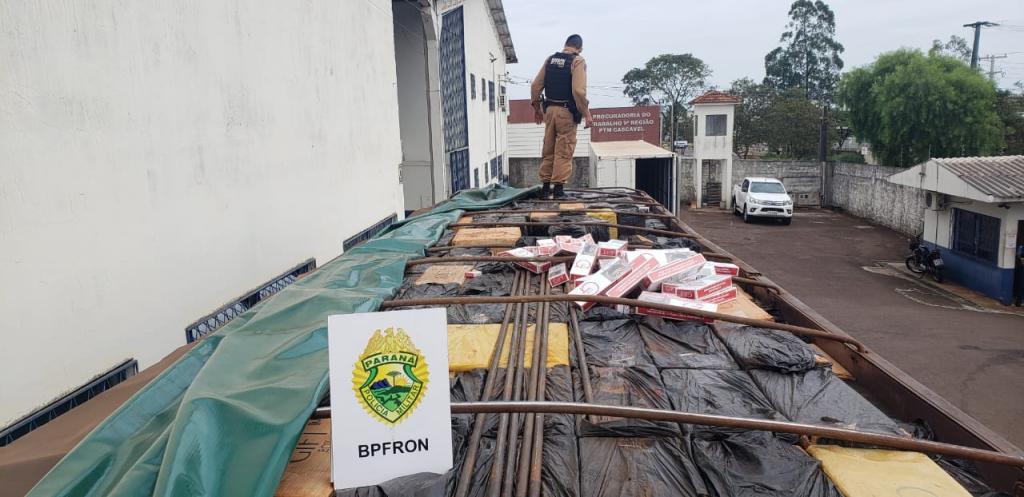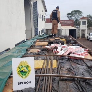 Em outra abordagem no patrulhamento, próximo ao município de Ouro Verde do Oeste, a equipe percebeu que uma carreta havia adentrado a uma estrada vicinal. Os Policiais Militares realizaram abordagem ao carreta e em revista, foram encontradas cerca de 1000 caixas de cigarros contrabandeados do Paraguai, sendo dada voz de prisão ao condutor. Os veículos e as mercadorias foram encaminhados para a Receita Federal do Brasil e o preso foi conduzido a Polícia Federal.