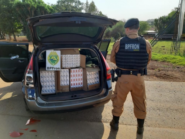 Na manhã de terça-feira, (11), em ação da Operação Hórus, Policiais Militares do Pelotão de Operações com Cães do BPFron - Batalhão de Polícia de Fronteira, realizavam bloqueio na cidade de Quatro Pontes, quando ha alguns metros do bloqueio o veículo Renault/Megane de cor azul, placas do Rio Grande do Sul-RS, efetuou retorno sob a pista, neste momento feito abordagem e durante a revista veicular foram constatados os cigarros .