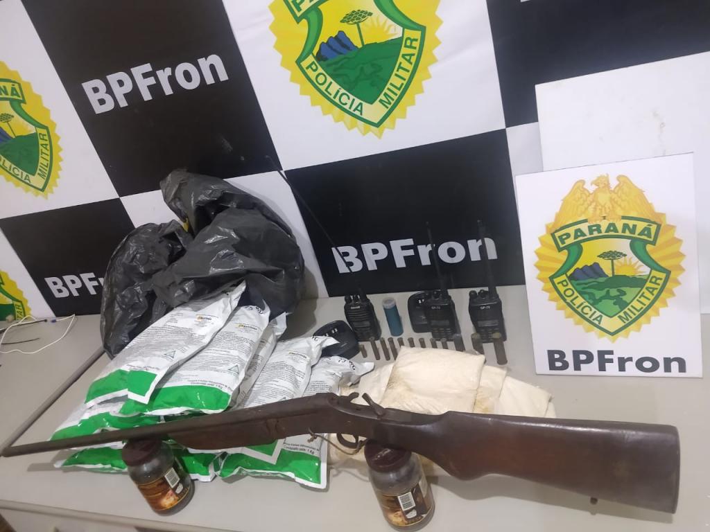 No local foram apreendidos uma arma de fogo calibre .20, 12,5 kg de agrotóxicos contrabandeados, rádios comunicadores e insumos para carregar cartuchos.