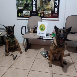 Os cães de faro do canil do BPFRON encontraram na residência duas mochilas, uma contendo drogas, uma arma de fogo e munições.