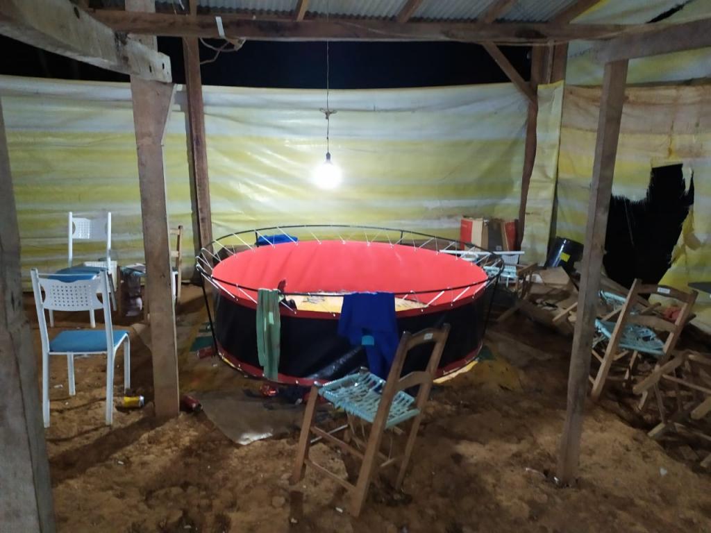 Diante da denúncia foi deslocado até o local, na comunidade de Vista Alegre, Barracão, onde foi feito a abordagem ao local sendo que várias pessoas evadiram-se em razão da baixa luminosidade, no local foi possível identificar o proprietário e outros proprietários das Aves, foram encontradas também 35 aves utilizadas para as práticas das competições.
