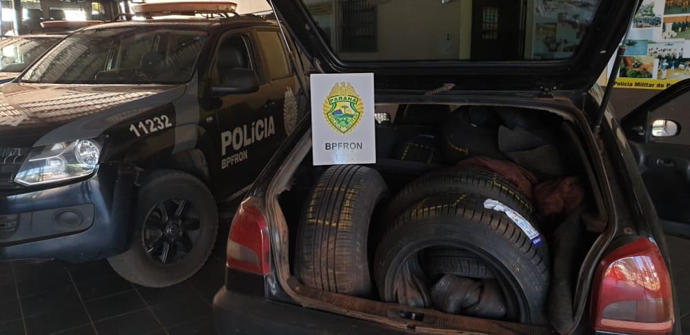 Os ocupantes foram identificados, sendo um homem de 38 anos e uma mulher de 48 anos, ao fazer revista veicular foi constatado que o automóvel estava carregado com aproximadamente 30 pneus de origem estrangeira sem a devida documentação necessária, e ainda informaram que receberiam a quantia de R$ 200,00 pelo transporte dos pneus.