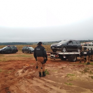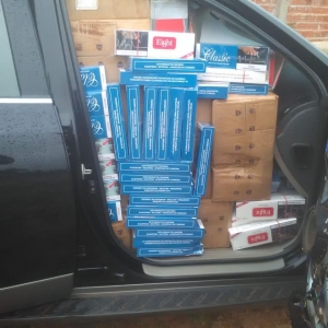 O condutor não acatou a ordem e empreendeu fuga adentrando em uma área rural, posteriormente abandonado o veículo e se evadindo, não sendo localizado. No veículo foram localizados 1 rádio transceptor, 1 caixa de essência de narguilé e cerca de 30 caixas de cigarros contrabandeados do Paraguai.