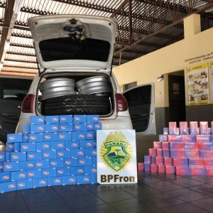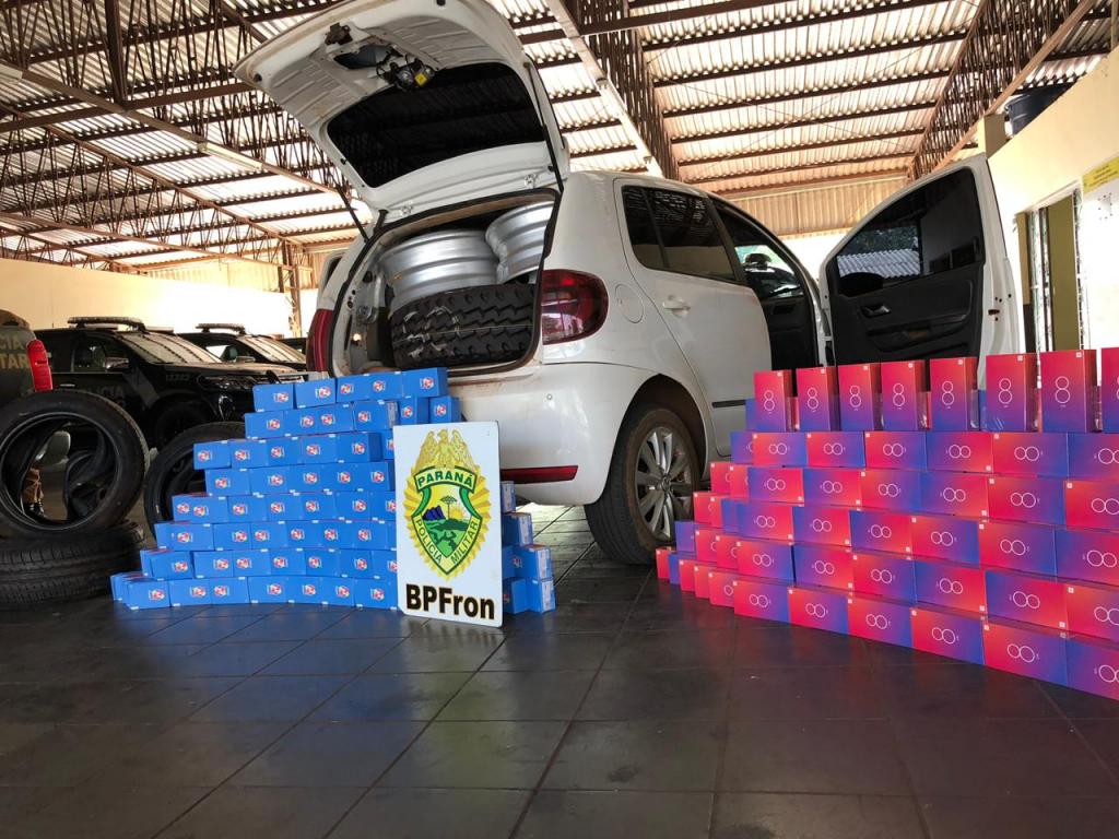 Após solicitação via sinais luminosos e sonorosa, o condutor do carro após alguns metros, encostou, sendo feita a abordagem, de pronto foi constatado no interior do Fox, quatro volumes de mercadorias de origem paraguaia, contendo 405 aparelhos celulares, aproximadamente 21 pneus e três rodas veicular, tudo de origem estrangeira sem os devidos trâmites aduaneiros para entrada no Brasil.