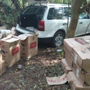 Em continuidade ao patrulhamento foram localizados dois veículos ao abandono, um Meriva e uma Parati, ambos de cor branca e sem queixa de furto ou roubo. Na Meriva foram localizados 66 pneus oriundos do Paraguai. Já na Parati foram encontrados 30 caixas de cigarros totalizando 1500 pacotes de cigarros contrabandeados do país vizinho.