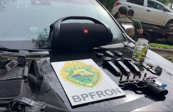 Foram acionadas as equipes do 6° BPM e do BPFron, as quais auxiliaram no cerco e nas diligências na mata. Foi abordada a primeira residência onde os indivíduos foram vistos e no primeiro cômodo, sobre a mesa, estavam uma pistola com 3 carregadores e uma capa de colete. Foi realizada revista completa e localizados diversos itens identificados como roubados na madrugada desta sexta-feira às 3h da manhã em Cascavel, em que 6 indivíduos armados amarraram uma família e fugiram com 2 camionetas e mais esses objetos.