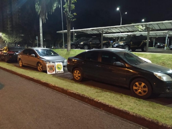 De imediato foi efetuado a abordagem de dois masculinos que estavam no local, sendo localizado um barco carregado com 50 (cinquenta) caixas de cigarros de origem paraguaia e 10 (dez) volumes de remédios e anabolizantes de origem paraguaia, também no local estavam 03 (três) veículos, ambos preparados para prática de contrabando, ao consultar o sistema policial foi constatado que os veículos eram produto de furto/roubo.
