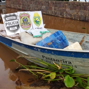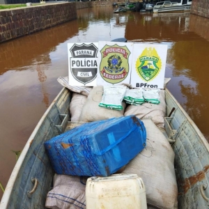 Com a aproximação policial os indivíduos abandonaram o barco,fugiram pela mata e não foram encontrados. No local foram apreendidos uma embarcação, 480 kg de agrotóxicos contrabandeados e um volume de eletrônicos.