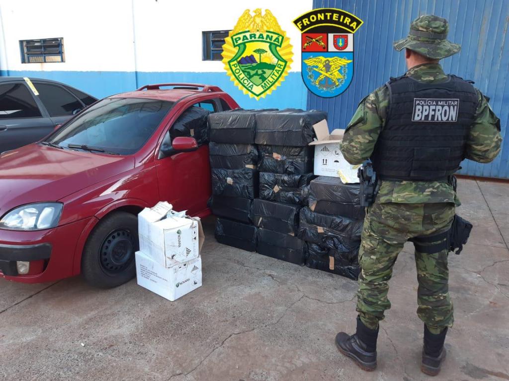 Neste sábado (09), durante patrulhamento pela cidade de São Miguel do Iguaçu policias militares do BPfron observaram grande movimentação de pessoas em um porto clandestino. Com a aproximação dos policiais os indivíduos empreenderam fuga em meio a mata abandonando dois veículos um Fiat/Strada e uma Chevrolet/Montana que estavam sendo carregados com 2600 pacotes de cigarro e 90 pacotes de agrotóxico.