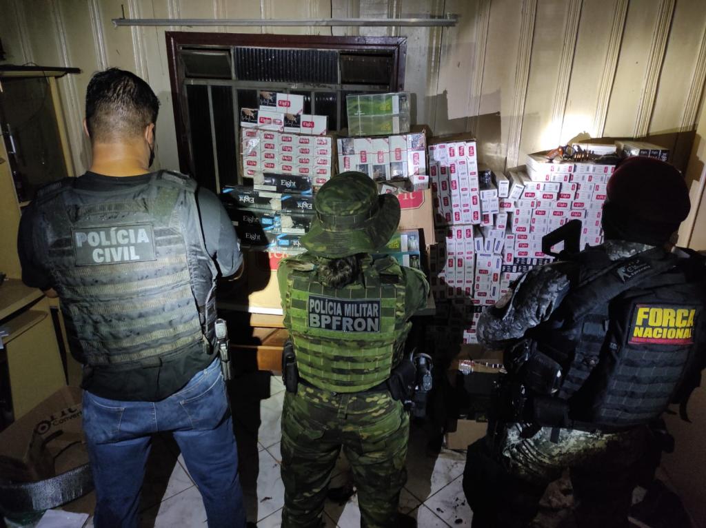 Com um homem foi encontrado um revólver calibre 38. Um dos indivíduos que estavam no estabelecimento comercial fugiu para uma residência próxima e foi abordado na residência pelos policiais que na casa encontraram 500 pacotes de cigarros contrabandeados além de pacotes de essência de narguilé.