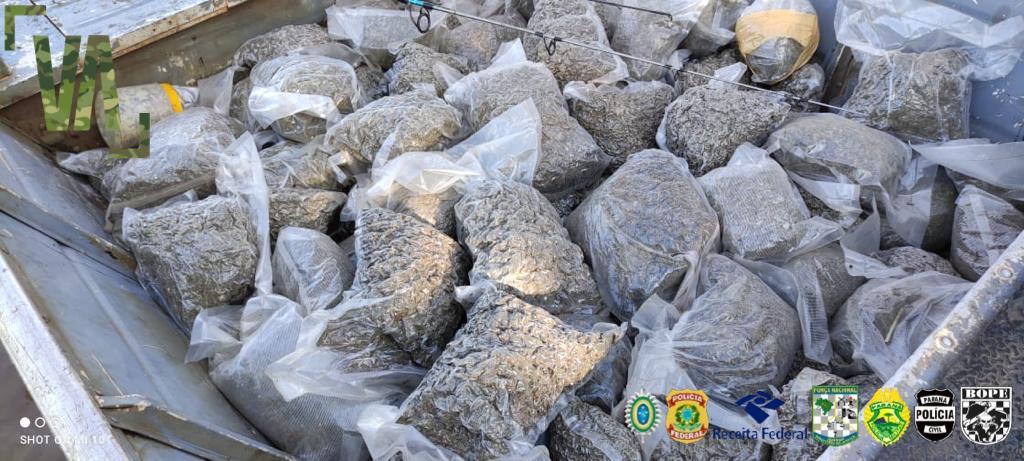 Na ação integrada entre BPFron, Polícia Federal, e Exército Brasileiro apreendeu: 02 embarcações, 02 motores de popa e cerca de 500 kg de maconha, trazendo enorme prejuízo ao crime organizado.