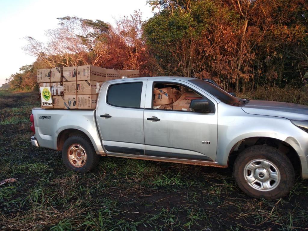 Diante disto os Policiais Militares adentraram a mata, para realizar buscas, e nessa diligência localizaram dois veículos tipo vans, sendo que ambos os estavam carregados com aproximadamente 200 caixas de cigarros ; continuando as buscas naquele local, próximo a barranca do Rio, foi localizado um veículo Chevrolet, S10 também carregado com aproximadamente mais 50 caixas de cigarros e 01 volume de agrotóxicos ; que após consulta do chassi da GM S10 foi constatado que era produto de furto no estado de São Paulo, conforme boletim de ocorrência daquele Estado.