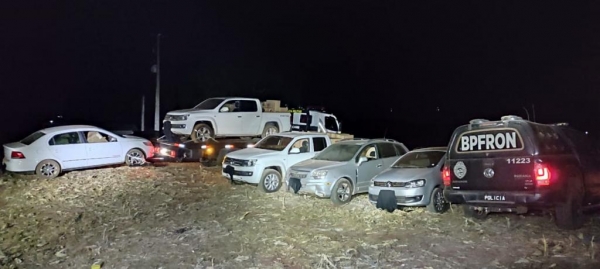 Com a aproximação policial, os indivíduos que ali estavam fugiram, abandonando cinco veículos carregados com cigarros contrabandeados.