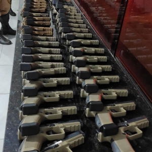 Em um dos veículos foram localizadas 93 armas de fogo, sendo 69 pistolas, 3 fuzis e 21 espingardas calibre GA12, sendo que uma destas pistolas estava municiada e carregada para uso pessoal.