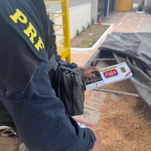 Após vistoria, os agentes constataram que sob uma fina camada de milho havia um carregamento de aproximadamente 500 mil maços de cigarros de origem estrangeira, configurando crime de contrabando. Além disso, foi identificada a adulteração de placa em um dos semirreboques.
