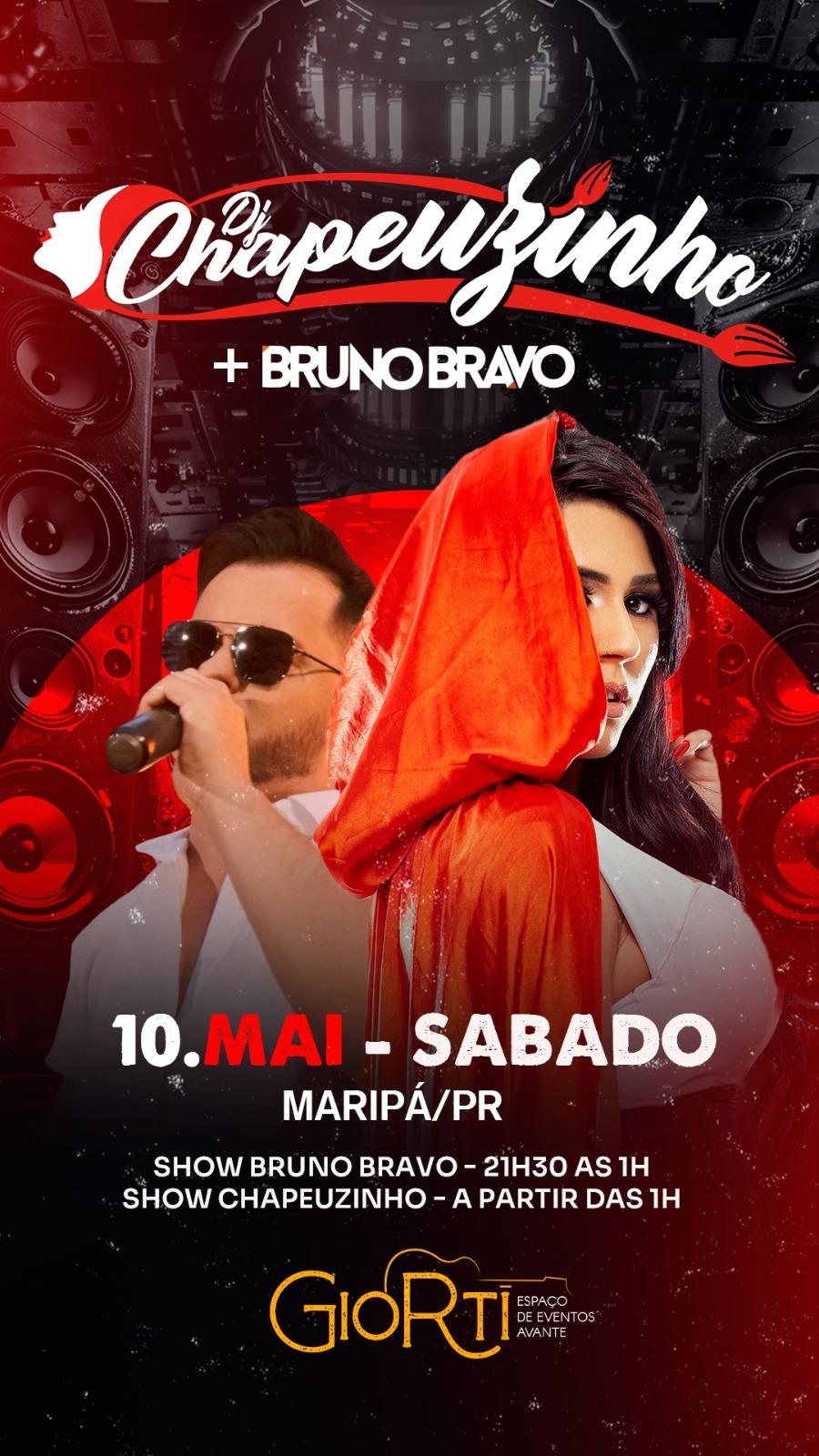 O Giortí Espaço de Eventos, em Maripá, será palco de duas grandes atrações neste sábado, 10 de maio. A noite começa com o show sertanejo de Bruno Bravo, das 21h30 à 1h. Logo após, terá show nacional= DJ Chapeuzinho assume o comando da festa com seu set eletrônico a partir da 1h da manhã.