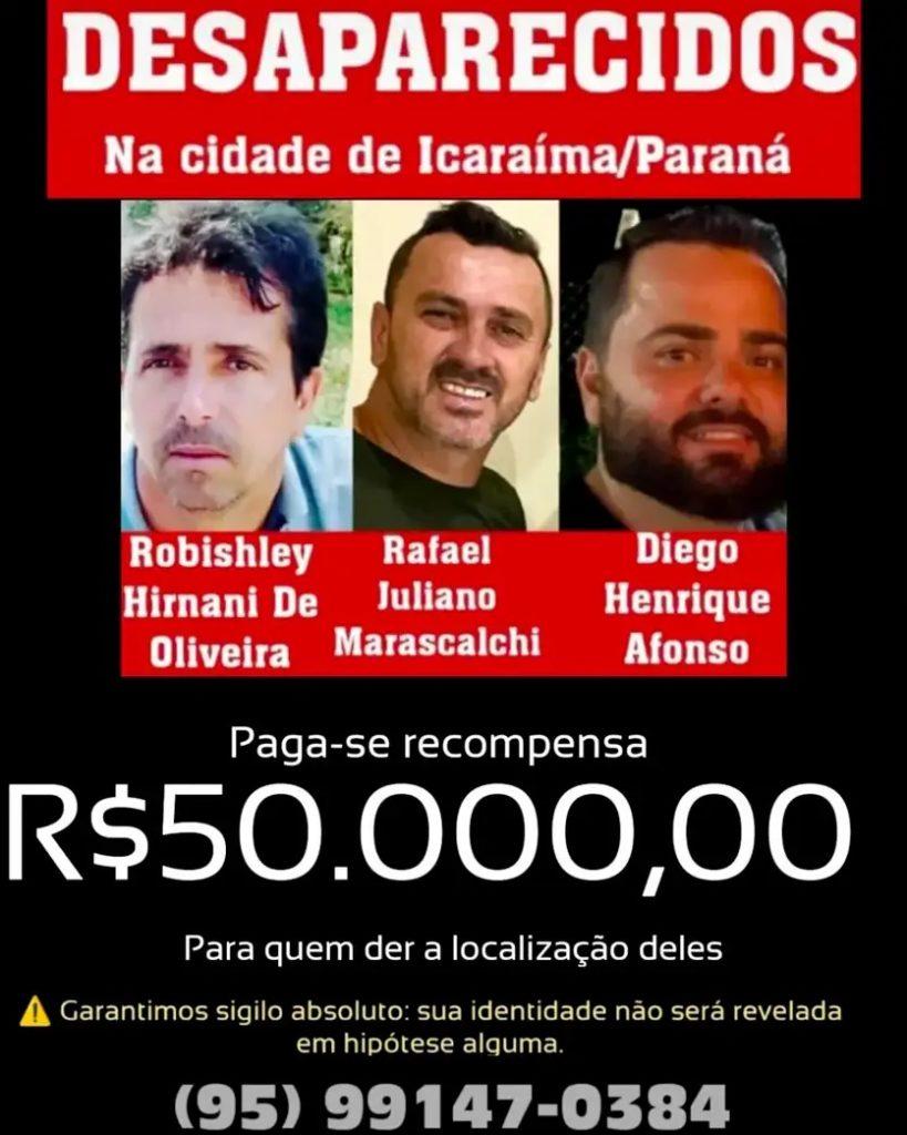 Familiares de três dos quatro homens desaparecidos em Icaraíma, no noroeste do Paraná, anunciaram uma recompensa de R$ 50 mil. O valor será pago a quem fornecer informações que levem ao paradeiro das vítimas ou dos suspeitos.