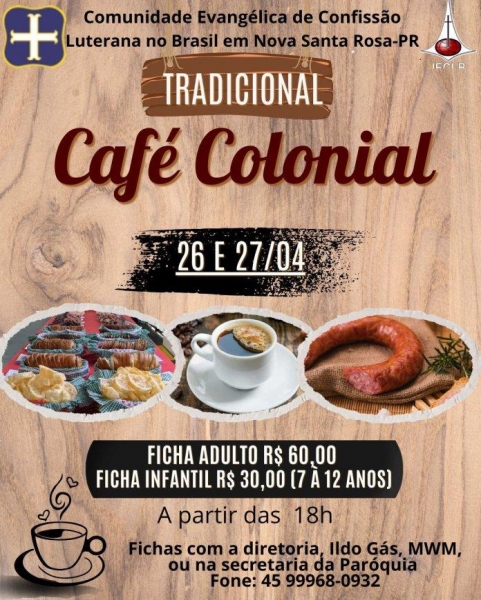 O Café Colonial, que acontece nesta sexta-feira (26) e sábado (27), faz parte da Programação de Aniversário dos 48 anos de Nova Santa Rosa.