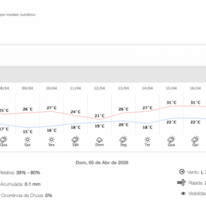 A segunda-feira ainda será quente, mas já com mudança no cenário. A máxima prevista é de 32°C e a mínima de 23°C. O sol aparece entre nuvens e há indicativo de chuva ao longo do dia, com aumento da instabilidade principalmente entre a tarde e a noite.