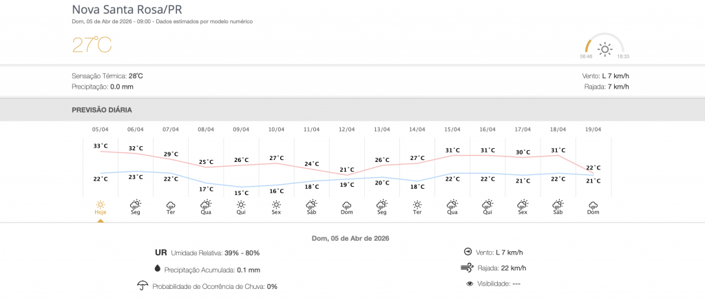 O tempo começa a mudar em Nova Santa Rosa após um domingo (5) de forte calor. De acordo com os dados do Simepar, os próximos dias terão redução nas temperaturas e aumento das instabilidades no Oeste do Paraná.