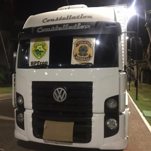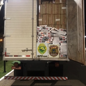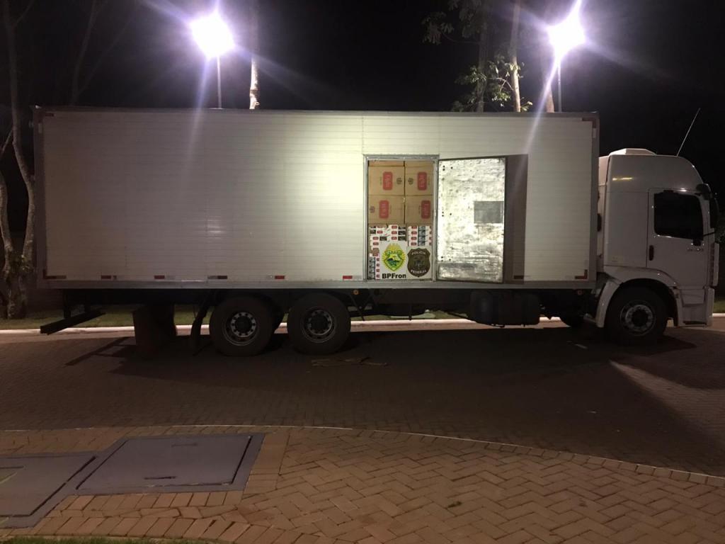 Na noite desta quarta-feira (20), um caminhão baú foi apreendido carregado de cigarros contrabandeados do Paraguai, esta é mais uma ação realizada por equipes que participam da Operação Hórus, integrada pela Polícia Federal , COBRA/BPFRON/PMPR, PRF, TIGRE/PCPR, BOPE/PMMS, Força Nacional e pelo Exército Brasileiro, com apoio da SEOPI – Secretaria de Operações Integradas/MJSP.