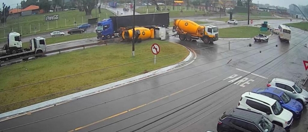 As imagens mostram que o veículo de carga, que transportava croncreto, tentou atravessar a rodovia, quando foi atingido pela carreta, que seguia sentido Cascavel.