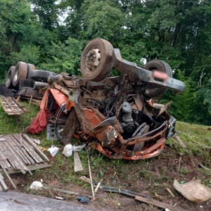Um caminhão Mercedes-Benz capotou no início da madrugada desta segunda-feira (24), na rodovia PR-182, na serra nas proximidades da cidade de Manfrinópolis no Paraná, região de Francisco Beltrão.