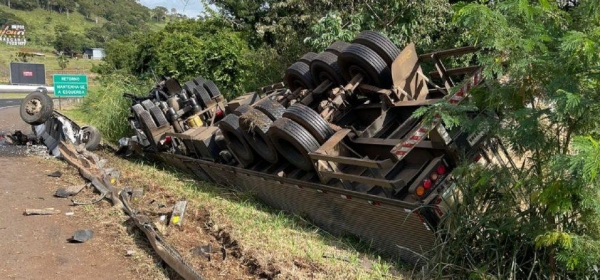 Um caminhão tombou após uma saída de pista na BR-277 em Matelândia, nas proximidades do Castelinho, na manhã desta sexta-feira (10).