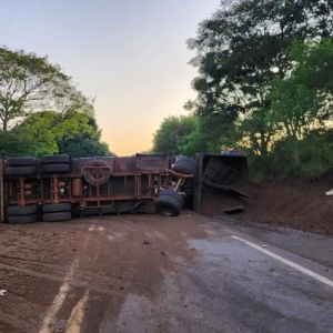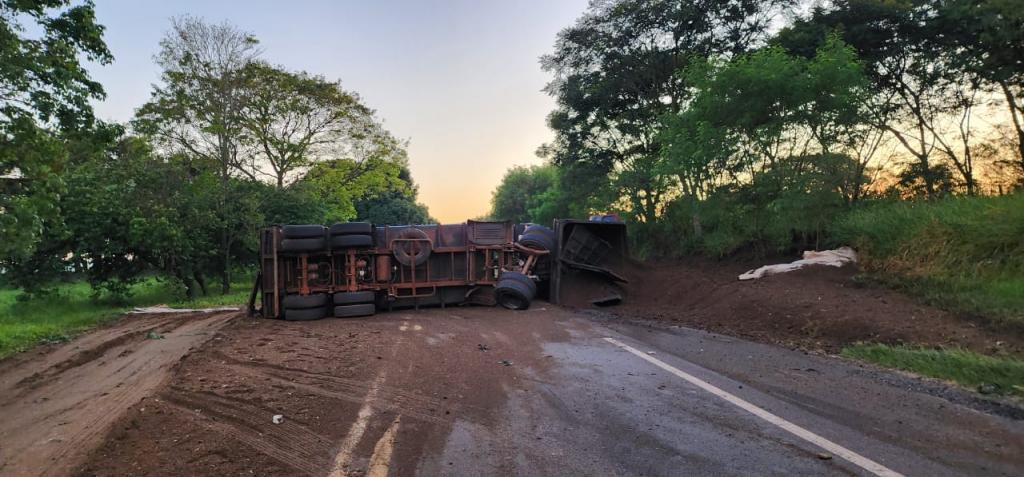 Caminhão carregado com esterco de aves tombou e interditou o quliômetro342 da PR 323 em Iporã, na manhã de terça-feira (4).