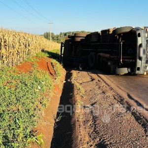 Um caminhão Mercedes-Benz carregado com feno tombou na noite de quinta-feira (13), na região da Curva do Rodeio, entrada da Linha Ouro Verde. Acidente aconteceu na PRc-467, no trecho entre a sede de Marechal Cândido Rondon e o distrito de Iguiporã.