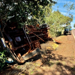Um caminhão Mercedes Benz, carregado com aproximadamente 300 sacas de milho recém colhidas, tombou às margens da rodovia PR 589 entre Nova Santa Rosa e Novo Sarandi.