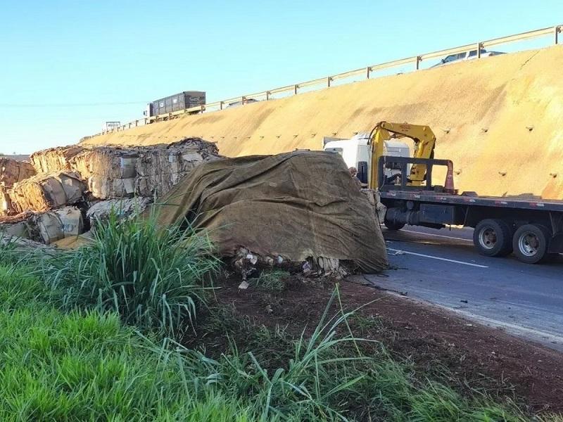 O acidente envolveu um caminhão carregado com materiais recicláveis, especificamente papelão, que tombou e ficou atravessado na pista. Um guincho foi solicitado para a remoção do veículo e da carga, que comprometeram parcialmente o fluxo de veículos no local.