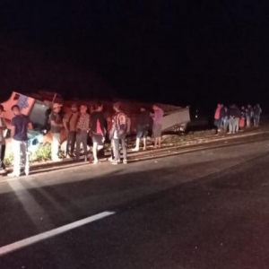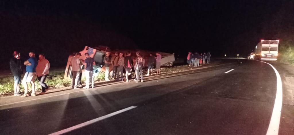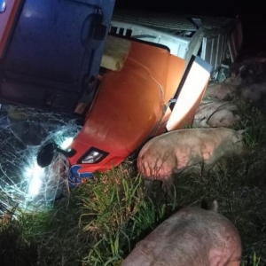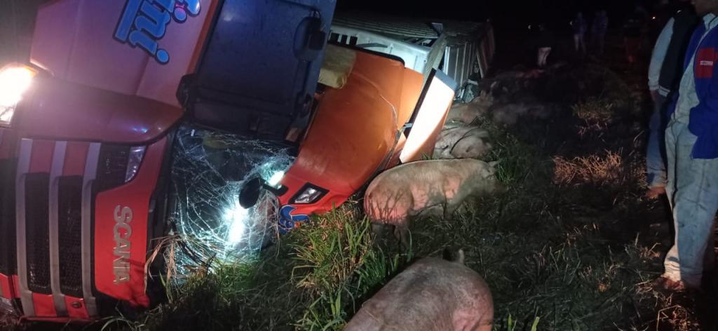 No município de Lindoeste, em torno das 20:50 de hoje, na BR 163, km 158,5 aconteceu uma saída de pista seguido de tombamento de um caminhão carregado de suínos.