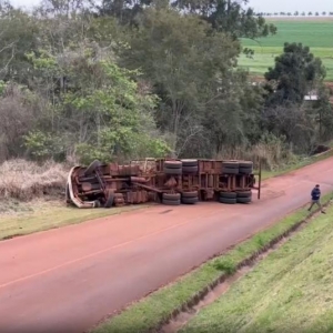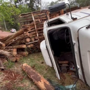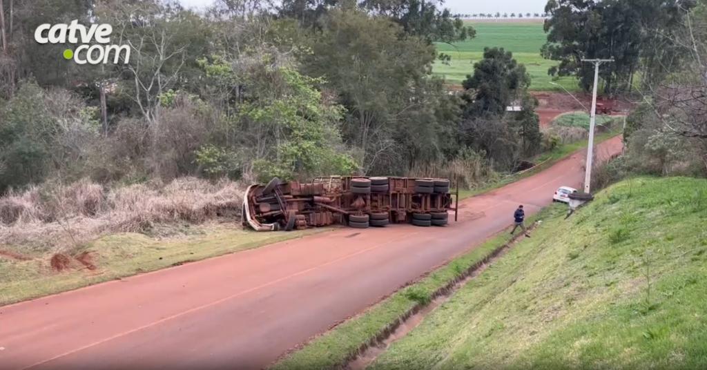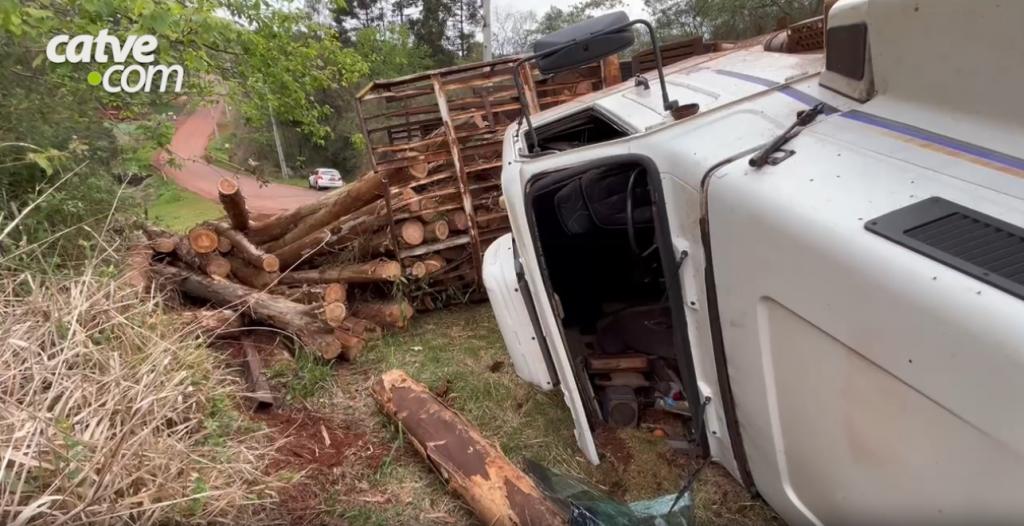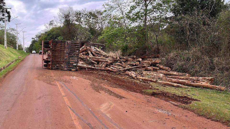 Um caminhão carregado com toras de eucalipto tombou na tarde desta segunda-feira (1º) na Estrada Alto São Salvador, em Cascavel.