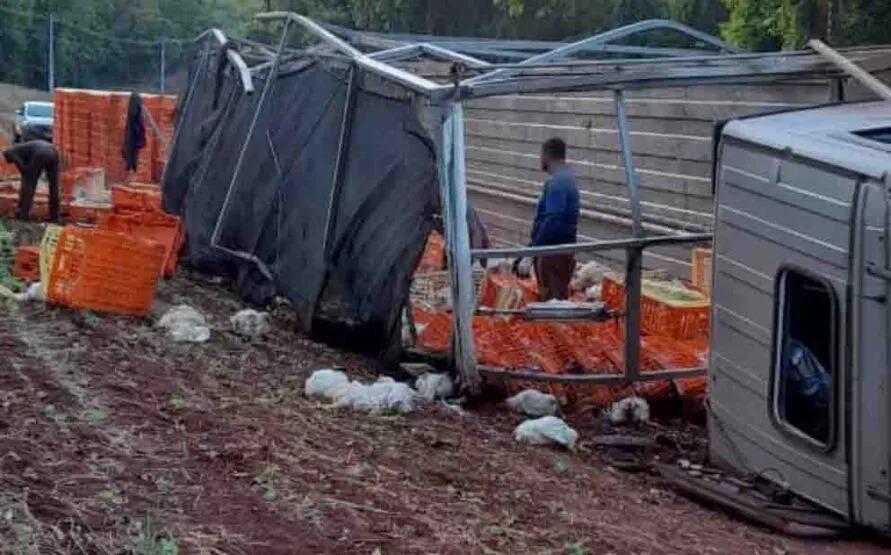 Um caminhão carregado de frangos tombou na Rodovia PR-082 na madrugada desta sexta-feira (25). O acidente aconteceu no trecho próximo a Mata Suíça, entre São João do Ivaí e Lunardelli.