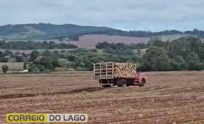 Na manhã desta quinta-feira (06), um caminhão carregado com palanques de madeira saiu da pista e parou dentro de uma lavoura às margens da PR-317, no distrito de São Clemente, em Santa Helena.