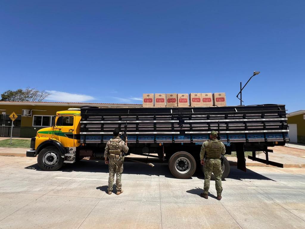 As equipes realizavam patrulhamento na área rural do município quando encontraram rastros de veículos saindo de uma região conhecida pela presença de portos clandestinos. Durante as buscas, foi localizado um caminhão Mercedes-Benz L/2014, abandonado sobre uma plantação de soja, carregado com o contrabando.